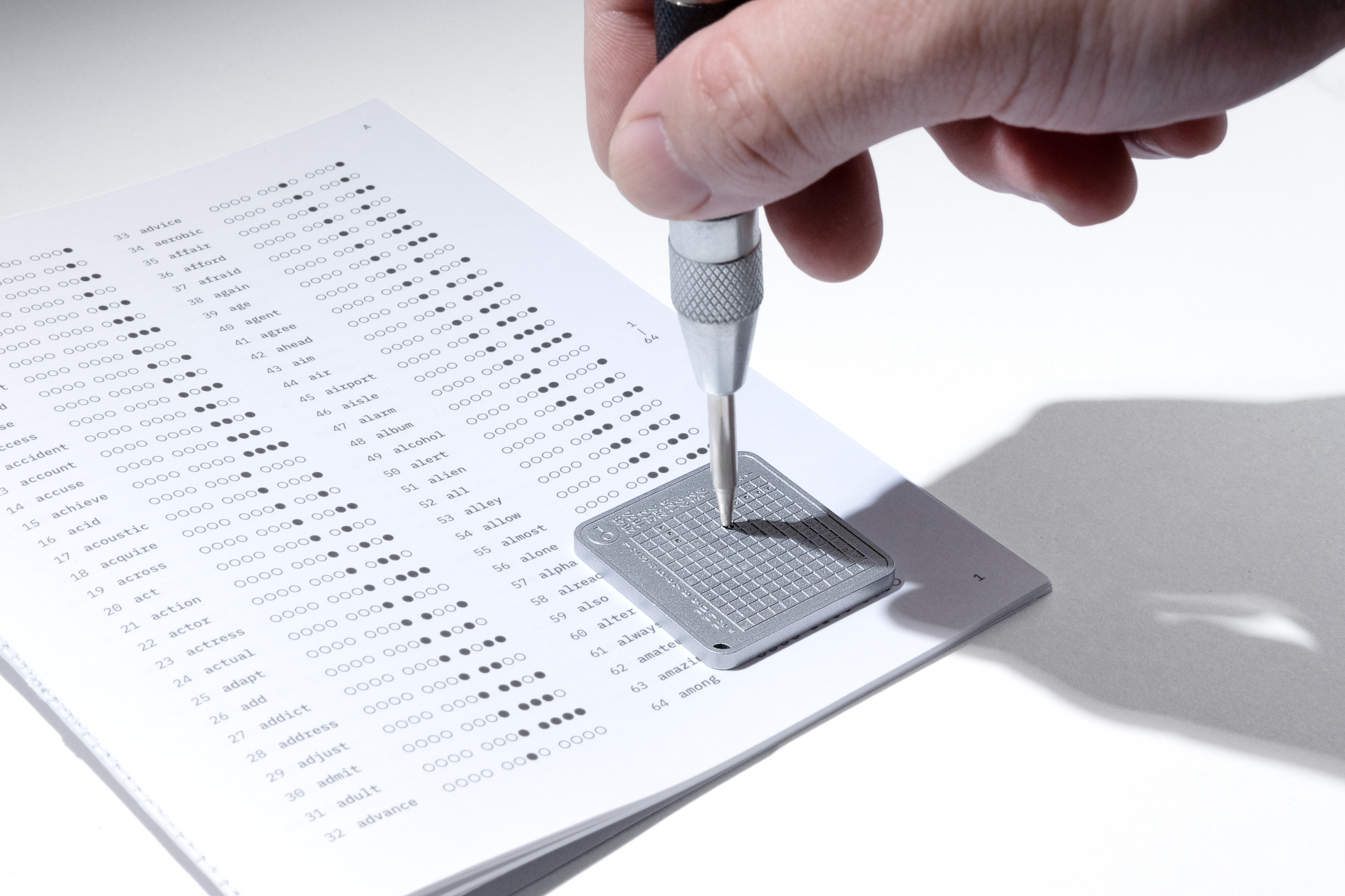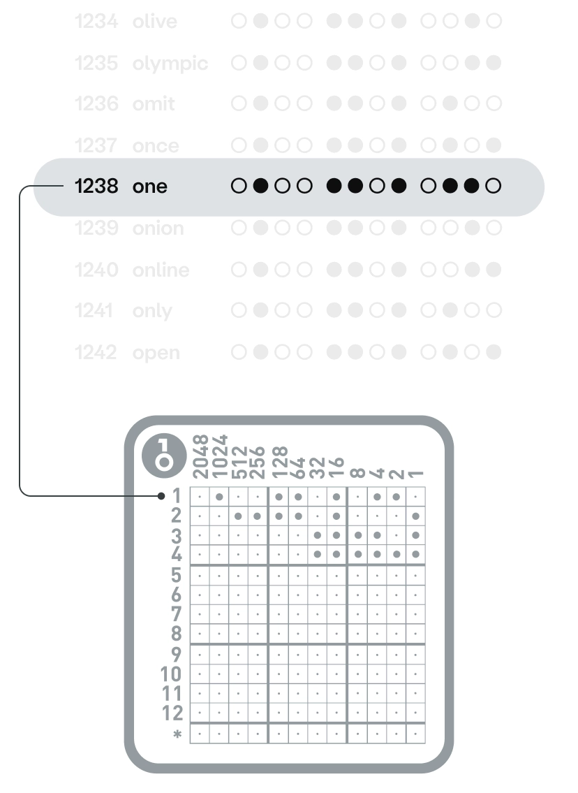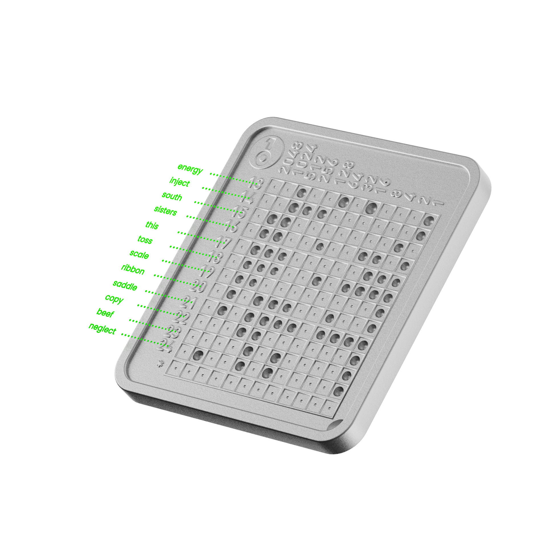 Alle Wallets wählen Begriffe aus BIP39. Diese alphabetische Liste hat 2048 Wörter. Anstelle von Buchstaben und Wörtern verwendet KeyTag auf intelligente Weise deren Wortlistenpositionen. Wir haben auch zwei zusätzliche Slots für Passphrasen hinzugefügt.